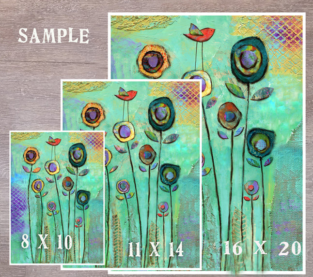 My original pieces are created using acrylics, inks, charcoal, paper and other elements to create unique one of a kind art full of whimsical imagery. Each piece is full of texture and depth that creates visual interest. This detail is shown on the quality of prints that I make.