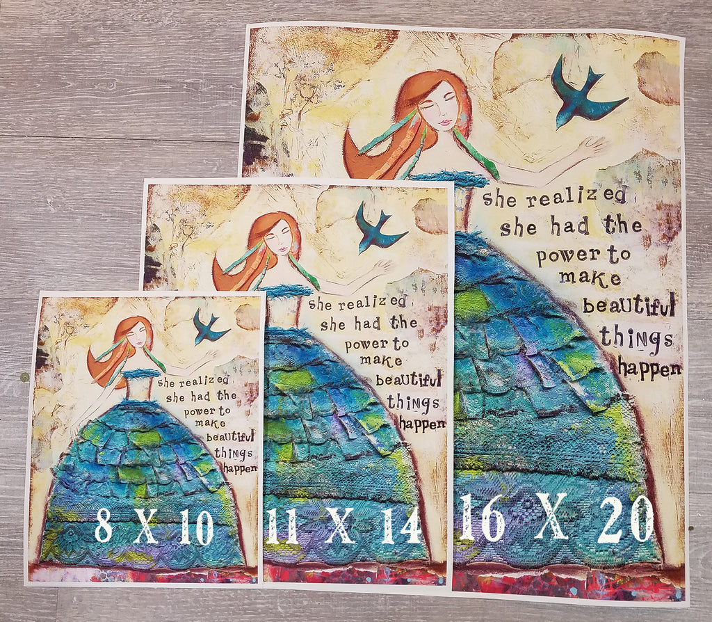 My original pieces are created using acrylics, inks, charcoal, paper and other elements to create unique one of a kind art full of whimsical imagery. Each piece is full of texture and depth that creates visual interest. This detail is shown on the quality of prints that I make.