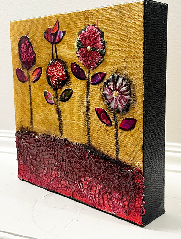 Creating my original work is the best part of my job! My studio is filled with bins and drawers full of scraps and pieces of papers and fabrics. It's a happy crazy mess in here and I love picking out different pieces to put in my work. I usually start a piece with a general plan of the main idea, but it completely evolves and changes as I work on the art. I never know where it's going to end up!
