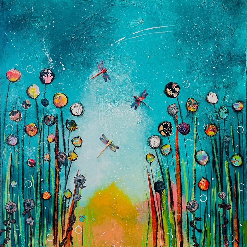 Dragonflies at Daybreak...36 x 36 Original Mixed media Painting and collage