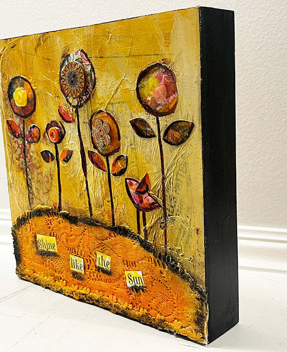 Creating my original work is the best part of my job! My studio is filled with bins and drawers full of scraps and pieces of papers and fabrics. It's a happy crazy mess in here and I love picking out different pieces to put in my work. I usually start a piece with a general plan of the main idea, but it completely evolves and changes as I work on the art. I never know where it's going to end up!