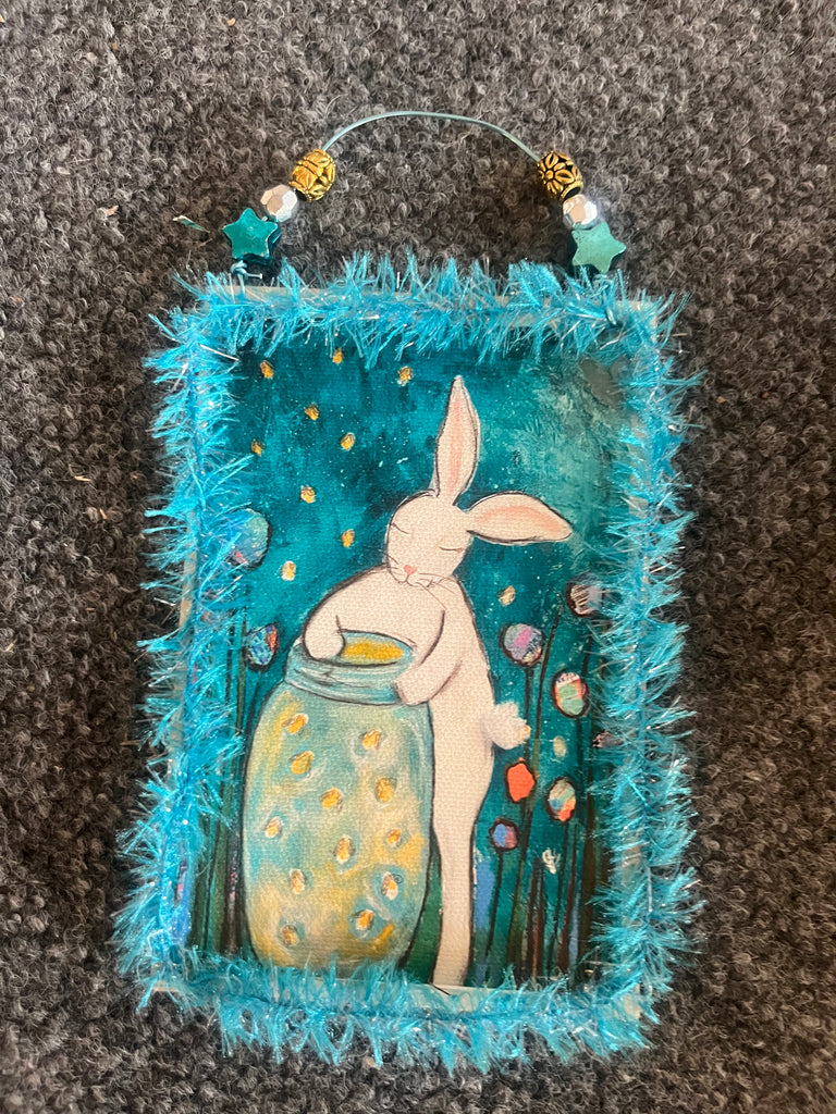 Mini canvas print on wood, with tinsel, beads, and wire.