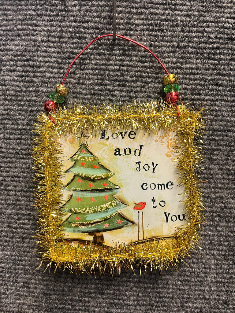 Mini canvas print on wood, with tinsel, beads, and wire.