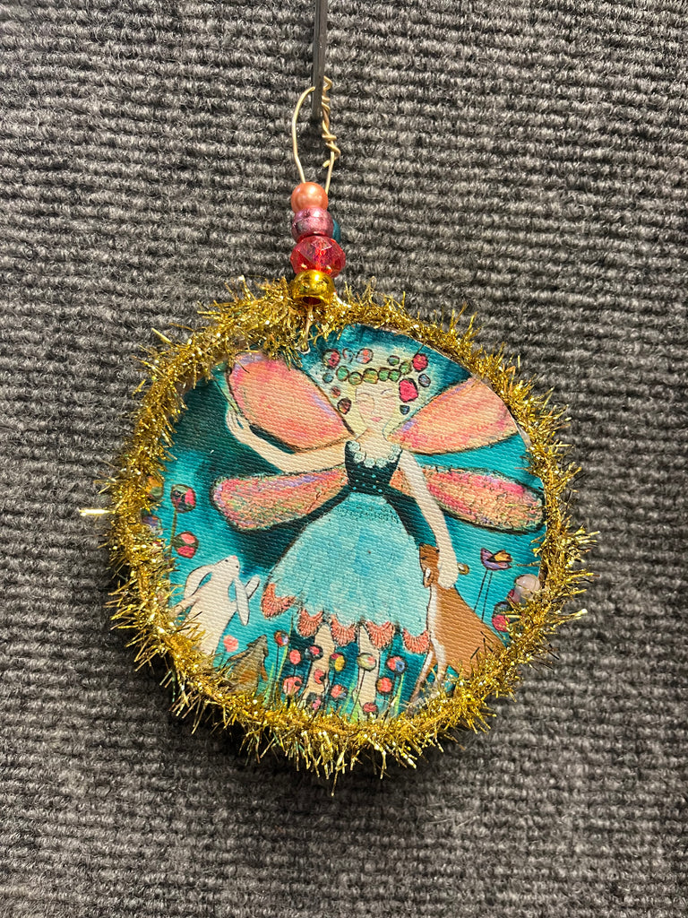 Mini canvas print on wood, with tinsel, beads, and wire.