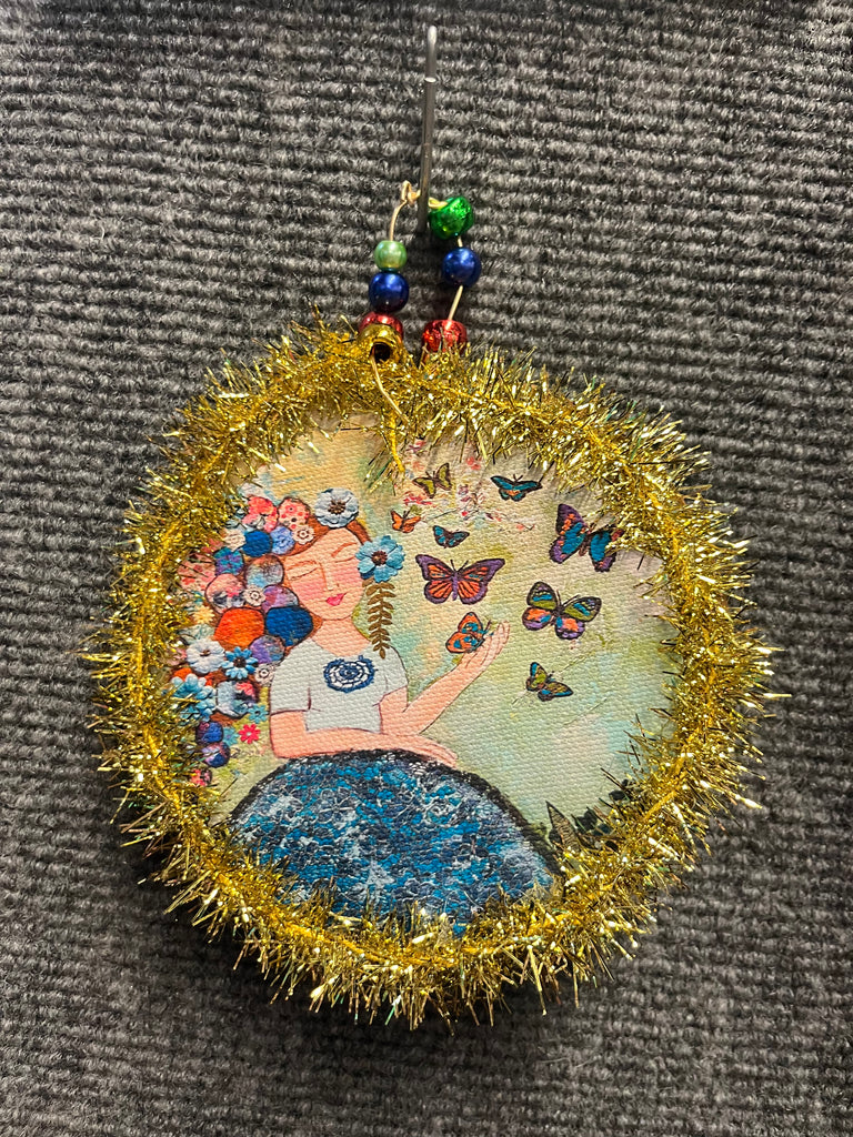 Mini canvas print on wood, with tinsel, beads, and wire.