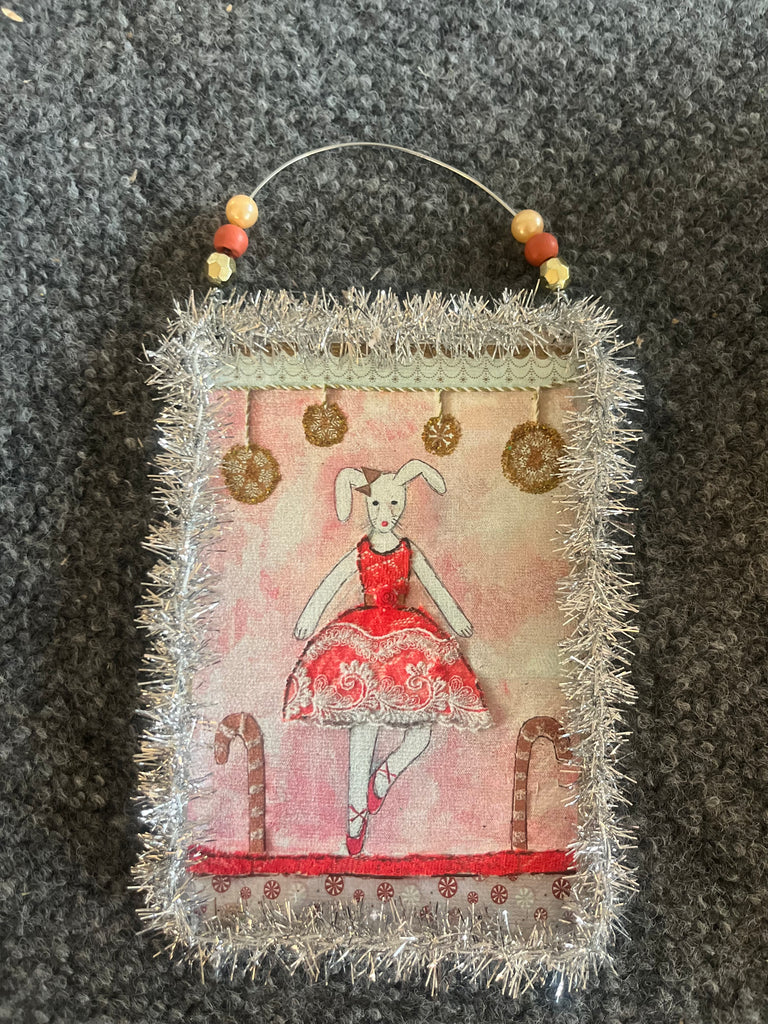 Mini canvas print on wood, with tinsel, beads, and wire.