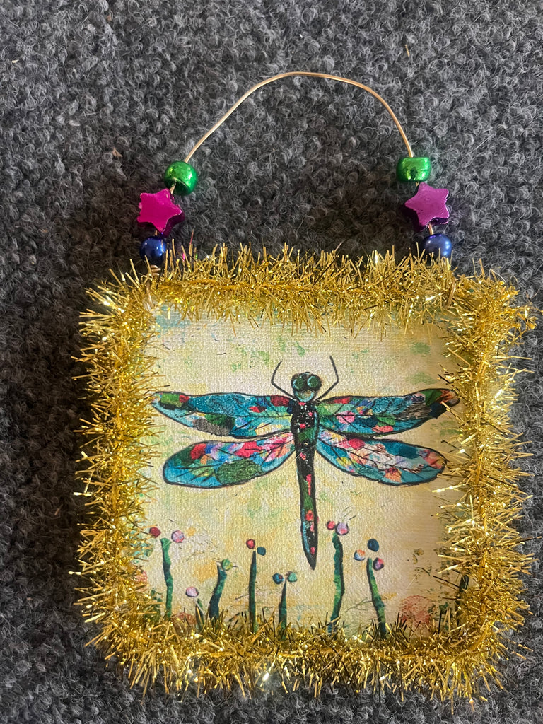Mini canvas print on wood, with tinsel, beads, and wire.