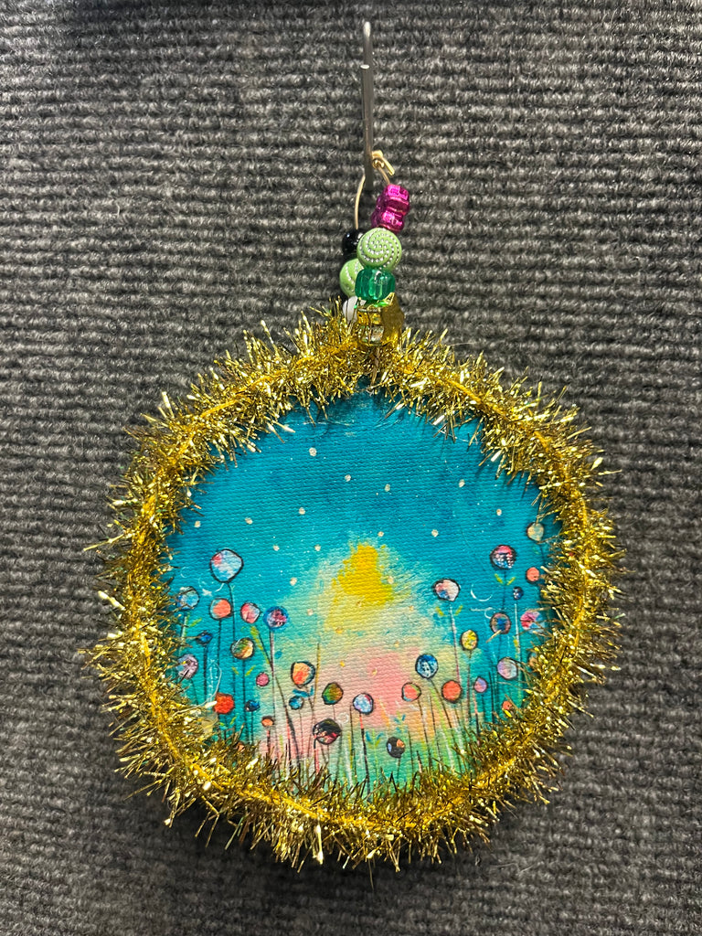 Mini canvas print on wood, with tinsel, beads, and wire.