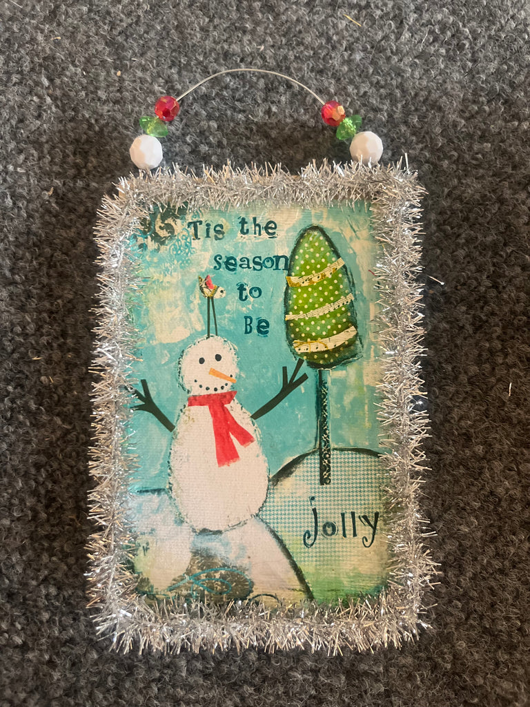 Mini canvas print on wood, with tinsel, beads, and wire.