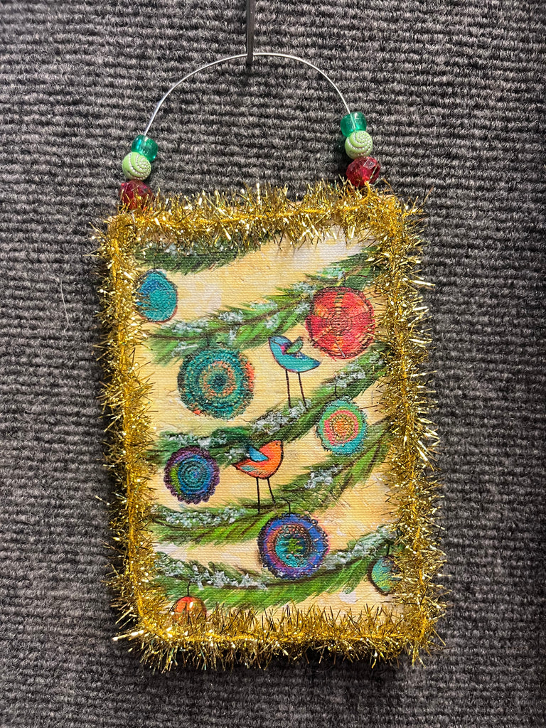 Mini canvas print on wood, with tinsel, beads, and wire.