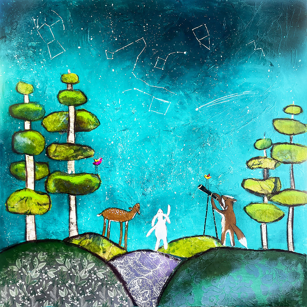 My original pieces are created using acrylics, inks, charcoal, paper and other elements to create unique one of a kind art full of whimsical imagery. Each piece is full of texture and depth that creates visual interest. This detail is shown on the quality of prints that I make.